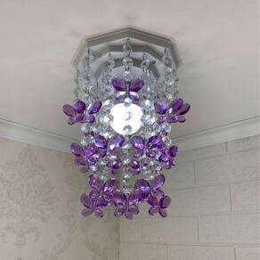 Base plafon octogonal de 17cm em acrílico na cor branca. Castanhas de acrílico transparente. Borboletas de acrílico cor lilás. Altura do lustre 25 cm. Voltagem: bivolt 127v 220v