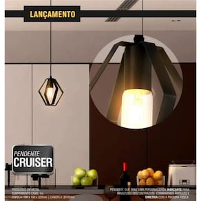Pendente Cruiser - TaschibraO pendente Cruiser Taschibra, traz uma personalidade marcante para ambientes descontraídos, combinando ângulos e simetria com a pintura fosca. - Produzido em Metal - Comprimento do cabo: 1m - Cúpula: 190x190x320mm - Canopla: 140mm - Soquete base E27 - Potência máxima: 40w - Lâmpada não inclusa
