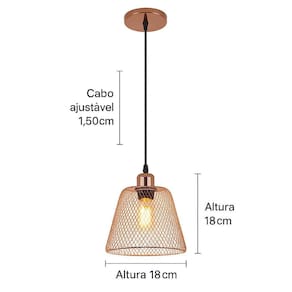 Luminária Pendente Decorativo em Tela Metal Rose 1,50cm Pendente Decorativo em Cobre Tela Metal Mesh Rose Transforme qualquer ambiente com charme e modernidade O pendente em cobre com tela mesh é perfeito para compor salas, quartos, varandas, cozinhas ou áreas gourmet, trazendo um toque sofisticado e aconchegante. Destaques do produto: Design elegante com acabamento em cobre, fácil de harmonizar com diferentes estilos de decoração. Estrutura em tela metálica, que valoriza a luz e cria um efeito visual diferenciado. Compatível com lâmpadas E27 não inclusa . Cabo ajustável de até 1,50 m, adaptável à altura desejada. Dimensões da cúpula: 18 cm altura x 20 cm largura . Ideal para quem busca iluminação decorativa e personalidade no ambiente. Dê um toque único ao seu espaço com este pendente exclusivo O produto é novo Sim, todos os produtos são novos. Caso o produto não supra minha necessidade posso devolver ou trocar O produto tem Sim, todos os produtos têm . Se ainda houver alguma dúvida estamos a disposição para responder de segunda-feira a sexta-feira das 08:00 às 17:30. Marca: Não Informado