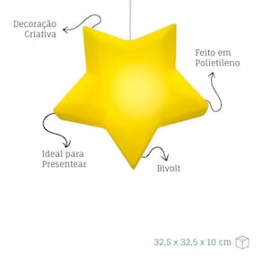 Instruções: Aceita alguns tamanhos de lâmpada LED que passem pela abertura.A Luminária Pendente Estrela transforma qualquer ambiente, trazendo charme e brilho ao quarto. Com design delicado e iluminado, ela cria uma atmosfera acolhedora e mágica, perfeita para quartos infantis, festas ou cantinhos especiais da casa.