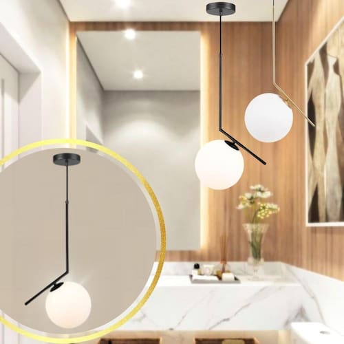 O globo é de vidro na cor branco leitoso fosco com 15cm de diâmetro e uma abertura inferior de 6,5cm para troca da lâmpada e encaixe na estrutura metálica. O corpo da luminária tem 45cm de altura, 25cm de profundidade e 15cm de largura. Capacidade para 1 lâmpada E27 até 60 Watts de potência. A fiação é na cor preta e possui 110cm, regulável, o que permite o ajuste de altura na medida perfeita. É compatível com tensão Bivolt, para ligação na corrente elétrica 110v / 220v. Já acompanha base de sobrepor em metal com 10cm de diâmetro x 2cm de altura, no mesmo tom de cor da luminária. Por fim, para maior praticidade e conveniência na instalação, segue com um kit fixação com travessa, parafusos, buchas e arruelas.