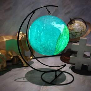 A luminária acompanha uma base metálica, que permite que ela fique pendurada e girando, criando um efeito ainda mais fascinante. Além disso, funciona com bateria recarregável, o que garante praticidade e beleza sem fios aparentes.