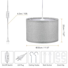 Altura ajustável Esta luminária pendente plug-in possui um cabo de extensão transparente de 18 AWG de 4,5 m de comprimento com um interruptor liga/desliga. A altura ajustável permite que você personalize sem esforço o comprimento de suspensão de acordo com suas necessidades e preferências específicas. Sombra de tecido de linho natural Com um tom de tecido de linho natural, proporcionando uma iluminação suave e agradável. A persiana de tecido adiciona um toque de elegância e cria uma atmosfera acolhedora em salas de jantar, salas de estar, quartos, cozinhas, escritórios ou áreas de estudo. (Nosso abajur de tambor é enrolado para melhor proteção e para evitar amassados durante o transporte) Uso Versátil Esta luminária pendente é adequada para vários tipos de lâmpadas, incluindo lâmpadas incandescentes, lâmpadas LED, lâmpadas CFL e lâmpadas de halogêneo. O soquete E26/E27 (lâmpada não incluída) oferece flexibilidade na escolha do ambiente de iluminação desejado para o seu espaço. Montagem fácil Instalar esta luminária pendente plug-in é rápida e sem complicações. Basta conectá-lo a uma tomada elétrica padrão e ajustar a altura de acordo. Nenhuma instalação complicada é necessária, o que o torna conveniente para qualquer usuário. Incluído na embalagem: Cada pacote inclui uma sombra de tecido de linho natural (30 x 20 cm/11,81 x 7,87"), um cabo transparente de 4,5 m com um interruptor ON/OFF E26/E27 soquete de lâmpada e alguns acessórios de instalação. As lâmpadas não estão incluídas, permitindo que você personalize a saída de luz com base em suas preferências. - Altura ajustável: esta luminária pendente plug-in possui um cabo de extensão transparente de 18 AWG de 4,5 m de comprimento com um interruptor liga/desliga. A altura ajustável permite que você personalize sem esforço o comprimento de suspensão de acordo com suas necessidades e preferências específicas. - Sombra de tecido de linho natural: com um tom de tecido de linho natural, proporciona uma iluminação suave e agradável. A persiana de tecido adiciona um toque de elegância e cria uma atmosfera acolhedora em salas de jantar, salas de estar, quartos, cozinhas, escritórios ou áreas de estudo. (Nosso abajur de tambor é enrolado para melhor proteção e para evitar amassados durante o transporte) - Uso versátil: esta luminária pendente é adequada para vários tipos de lâmpadas, incluindo lâmpadas incandescentes, lâmpadas LED, lâmpadas CFL e lâmpadas de halogêneo. O soquete E26/E27 (lâmpada não incluída) oferece flexibilidade na escolha do ambiente de iluminação desejado para o seu espaço. - Montagem fácil: instalar esta luminária pendente plug-in é rápida e sem complicações. Basta conectá-lo a uma tomada elétrica padrão e ajustar a altura de acordo. Nenhuma instalação complicada é necessária, o que o torna conveniente para qualquer usuário. - Incluído no pacote: cada pacote inclui uma sombra de tecido de linho natural (30 x 20 cm/11,81 x 7,87"), um cabo transparente de 4,5 m com um interruptor ON/OFF E26/E27 soquete de lâmpada e alguns acessórios de instalação. As lâmpadas não estão incluídas, permitindo que você personalize a saída de luz com base em suas preferências.