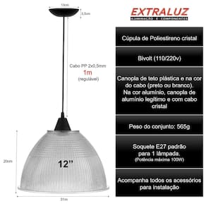 Essa luminária possui um pendente prismático de 12 polegadas, com 20cm de altura e 31cm de diâmetro. O modelo Prismático Cristal traz um toque de elegância ao ambiente, tornando-o moderno e sofisticado. Além disso, o produto é bivolt, ou seja, pode ser utilizado em redes elétricas de 110v ou 220v.