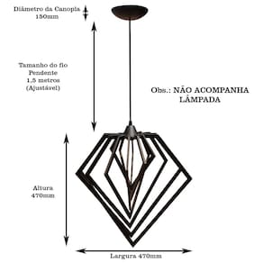Pra você que está decorando ou buscando melhorar os seus ambientes, saiba que uma boa iluminação pode transformar o seu espaço, trazendo mais requinte, elegância, personalidade e conforto. Produto é enviado desmontado. Para melhor envio do produto, as hastes são enviadas desmontadas, a montagem é muito simples, e não necessita de nenhuma ferramenta, apenas encaixes. será enviado instruções de como montar . Especificações técnicas: Dimensões do produto cxlxa: 47 x 47 x 47cm; Peso do produto: 0,7kg Cabo: pp, cor preto, 1,5 metros ajustável ; Soquete: tipo e-27; Lâmpada: aceita diversos tipos eletrônica ou led - obs.: não acompanha lâmpada; Voltagem: 110v / 220v bivolt ; Produto irá desmontado e acompanha todos os componentes elétricos para instalação cabo, canopla e componentes de fixação . Marca: Não Informado