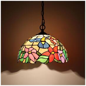 Luminária pendente artesanal em estilo Tiffany com instalação por plugue, composta por base metálica em tom bronze, cúpula em vidro colorido tipo vitral azul com motivo beija-flor, soquete E26 para lâmpadas LED ou incandescentes até 100 W, cabo elétrico de aproximadamente 457 cm, corrente metálica de 102 cm e interruptor em linha tipo botão. A cúpula possui cerca de 30,5 cm de diâmetro e 17,8 cm de altura, adequada para salas de jantar, salas de estar, quartos, corredores, halls e áreas de leitura em ambientes internos.