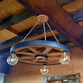 Luminária roda de carroça rústica, fabricado em mdf, pintado a mão e envernizado, deixando um acabamento envelhecido perfeito.