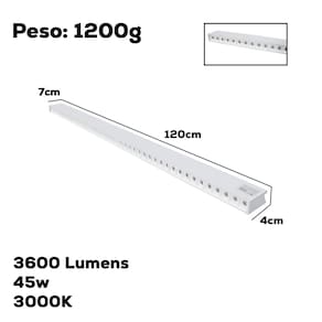 Tamanho e Design: Com 120cm de comprimento, a luminária possui um perfil linear e sobrepor, que se adapta perfeitamente a diversos estilos de decoração, desde os mais contemporâneos até os mais clássicos. Sua estrutura discreta e elegante permite uma instalação limpa, complementando qualquer ambiente sem ocupar espaço desnecessário.