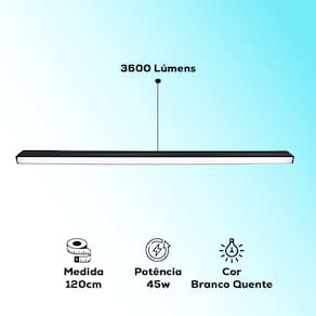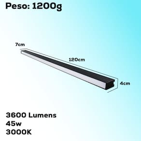 Tensão: AC85-265V 50/60HzPotência: 45WFluxo Luminoso: 3600 LumensTemperatura de Cor: 3000KRA:80Dimensão: 120cm x 4cm x 7cm Marca: RL LIGHTING Ean: 7898676929687
