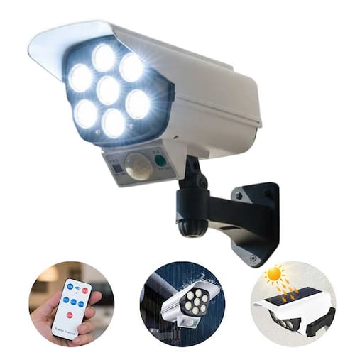 Luminaria Solar Dummy Camera é composta por 77 leds que são recarregados por um painel solar de 5 volts. Captando presença a partir de 5 metros. A Luminaria solar Dummy camera conta com um controle remoto que permite alterar entre 3 funções, para que o cliente decida qual é a mais viavel.