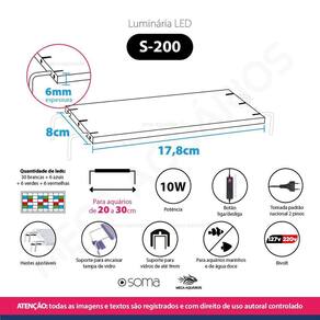 Luminária de led Soma S-200 ultra fina para aquário marinho ou água doce, luz WRGB, encaixa no vidro - Bivolt 110v 220vAs luminárias Soma da linha S possuem design moderno e ultra fino, são confeccionadas com materiais resistentes e oferecem luminosidade na totalidade do aquário.Características:Para aquário de 20 a 30cmBaixíssimo consumo de energiaIluminação de alto rendimentoLonga vida útilDesign modernoFácil instalaçãoResistenteBotão liga desligaComposta por luz WRGB branca, vermelha, verde e azul as luzes acendem juntas Não possui controle de corLuz alcança a totalidade do aquário não é luz focal Hastes ajustáveis para melhor encaixePossui apoio para encaixar a tampa de vidro ela fica apoiada em cima do suporte cinza O reator fica separado da luminária junto ao fio Tomada padrão 2 pinosPode ser ligado em timersPode ser utilizado em aquário marinho ou de água doce.Dicas importantes:1 - Sempre retire o equipamento da tomada elétrica antes e durante a manutenção do seu aquário.2 - Para garantir a eficiência da luminosidade, limpe a luminária com um pano macio e úmido sem abrasivos a cada 15 dias.3 - Utilize 2 ou mais luminárias para obter o rendimento luminoso adequado conforme o tamanho, a profundidade e a exigência de iluminação do ambiente que você deseja criar.Especificações técnicas:Marca: SomaModelo: Luminária Soma S-200Potência: 10WVoltagem: 110v / 220v bivolt Composição: plástico, metais e circuitos eletrônicosCor da luz: WRGB branca, vermelha, verde e azul Quantidade de leds: 30 brancas + 6 azuis + 6 verdes + 6 vermelhasSuporte para vidro até 9mmTamanho: 17,8 x 8 cmEspessura: 6mmTamanho do fio: 140 cmServe para aquário de 20 a 30cmPeso aproximado: 247gObrigado pela visita e boas comprasAtenção:Imagens e textos registrados. Todos os direitos reservados a essa loja e as lojas parceiras devidamente autorizadas.
