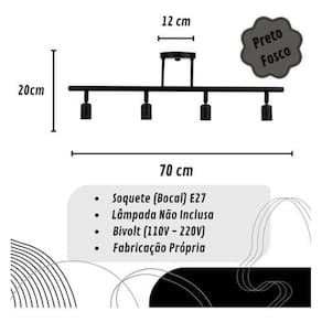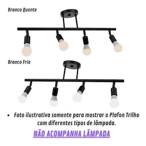Luminária plafon 4 e27 trilho preto fosco --------------------------------------------------------------------------------------------------------------- Descrição do produto: Modelo: plafon trilho articulável 4 e27 Material: alumínio Cor do acabamento: preto fosco Tensão de rede: bivolt 127v / 220v Ambiente: interno/externo : 6 meses contra defeitos de fabricação Dicas importantes Produto com disponível. Confira o produto desejado antes de finalizar a compra. Tire todas as suas dúvidas com o vendedor. Mantenhas seus dados atualizados, após a compra as informações não poderão ser mudadas. Antes de abrir uma reclamação consulte o vendedor, temos o prazer em entender para atender. Aguardamos sua avaliação positiva : Contra defeitos de fabricação. Envio Loja de fábrica Marca: Não Informado