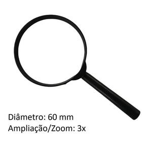 Lupa Com Cabo Plástico Manual Aumento 3XA Lupa de mão ideal para leituras, avaliação de joias, circuitos e diversas atividades profissionais e para o Lazer.Produto: NOVO, com Nota FiscalReferência: WPL10003Material/composição: Polipropileno PoliestirenoAmpliação/zoom: 3xIdeal para:- Visualizar objetos e textos pequenos:- Avaliação de Jóias;- Artesanato- Estética;- Montagem de pequenas peças e estruturas;- Circuítos;- Relojoaria;- Leitura;- Cartografia/Mapas;- Escritórios;- Agronomia análise de folhas, insetos, pragas, etc ;- Eletrônica análise minuciosa de soldas e falhas em circuitos, etc ;E diversas outras atividades...Especificações:Diâmetro: 60mmComprimento do Cabo: 6cmComprimento Total Cabo + Lente : 12cmPoder de ampliação: 3XQuantidade de lentes: 1Com Luz: NÃOConteúdo da embalagem: 01 Lupa de Mão a cada unidade compradaDimensões da Embalagem:Altura:1,5cmLargura:6,5cmComprimento:13,5cmPeso aproximado do produto embalado: 30gObservação: Imagens ilustrativas
