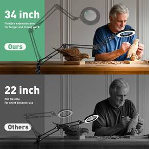 Braço giratório extralongo de 3 seções: esta lupa iluminada de 12x possui um braço giratório reforçado de 3 seções que se estende até 108 cm, oferecendo o máximo de alcance e flexibilidade para grandes espaços de trabalho. Equipado com 3 botões, 6 molas e um sistema de conexão avançado, garante ajustes precisos e estabilidade. Iluminação LED brilhante regulável: esta lâmpada de lupa atualizada possui 146 LEDs de alto brilho, 50% mais brilhantes do que as lâmpadas de mesa padrão, proporcionando iluminação uniforme e sem brilho. Com 5 modos de cor, 10 níveis de brilho e uma função de memória, oferece iluminação personalizável através de um controlador de 4 botões montado na parte superior. Braçadeira de metal de 4 vias atualizada: feita de liga de alumínio durável, esta lâmpada de ampliação possui um grampo de metal forte com quatro orifícios de suporte de 1,2 cm para montagem horizontal, vertical, lateral e invertida. Fixa-se firmemente a superfícies de até 7 cm de espessura, com almofadas antiderrapantes duplas para estabilidade e proteção contra arranhões. Ampliação poderosa e lente de vidro real: esta lupa com luz e suporte vem com uma lente de vidro real 12X que oferece uma visão de alta definição sem distorção para trabalhos complexos. Perfeito para artesanato, pintura em miniatura e costura, aumenta a clareza em cada projeto. Trabalho próximo e presente adequado: Feito com materiais de qualidade e design profissional, esta lupa com luz é um presente ideal para familiares, amigos e profissionais como hobby, leitura, quebra-cabeça, projeto, reparo, solda, ponto cruz, unhas, etc. e degeneração macular de idosos. Se estiver insatisfeito, . A satisfação do cliente é nossa maior prioridade.