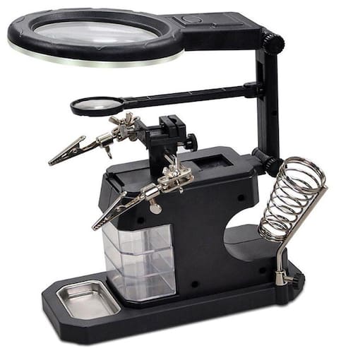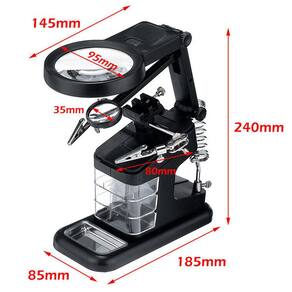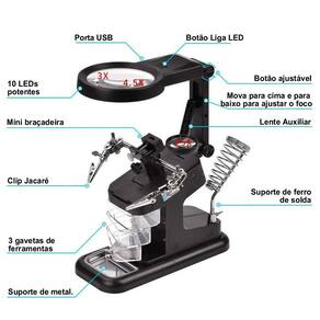 A Lupa De Mesa Bancada 16 Leds Com Garras Suporte Ferro Solda 3 Gavetas CBRN20393 da Commerce Brasil é um equipamento multiuso extremamente útil para reparos em equipamentos eletrônicos, chips, placas, soldagem de fios, manutenção de pequenos objetos que exijam uma melhor visualização e precisão, como, por exemplo, micro soldagens, artesanato, bricolagem, joias, etc.