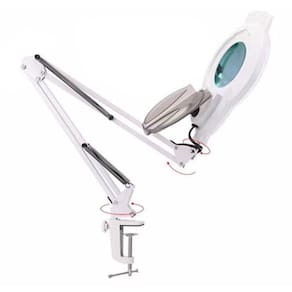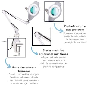 A lupa possui um suporte garra para fixar na mesa. Flexivel para mover em varios angulos, permitindo uma inspeçao detalhada.