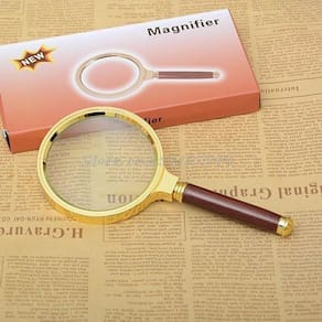 Lupa luxo de 70mm aumenta até 3.5 vezes Especificação do produto Cor: golden Diâmetro: 80mm Tamanho: 15,3 x 95 x 14mm. Lupa de mão de 80mm Material: mogno antigo + vidro Adequado para visualizar impressões pequenas ou objetos. Potência de ampliação: 3.5 x Material: estrutura de liga de zinco, alça superfície de madeira , Lente de vidro. É ideal para ampliar jóias, pintura, escultura, artesanato, selos, Costura, reparação de acessórios pequenos etc.
