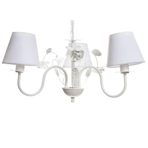 O Lustre 3L Floral Branco Quarto Bebê Infantil Menina Menino é perfeito para incrementar a sua decoração e dar um toque especial ao seu ambiente. Sua estrutura traz mais modernidade, elegância e sofisticação para a sua decoração. Esse produto deixará seu cômodo com uma iluminação fantástica. Afinal, um ambiente agradável conta sempre com uma boa iluminação que traga mais vida e aconchego para o ambiente, além de valorizar os detalhes da decoração.Quebre a monotonia com este lustre torneado com cúpula em tecido e detalhes encantadores, que será um elemento decorativo determinante para o espaço em que estiver exposto. Proporciona uma iluminação uniforme e agradável para o quarto do bebê.• Dados TécnicosLustre de 3 lâmpadas em alumínio com pintura eletrostática branca e cúpulas em acetato forrado com tecido. Galho de metal com flores brancas e folhas verdes, decorado com borboletas de acrílico que combinam com a cor das flores.• Lâmpadas SuportadasEconômicas/ Led: Qualquer LâmpadaIncandescente amarela : Até 40w por Soquete• MedidasLargura: 42 x 42 cmAltura: 23 cmCorrente: 25 cm
