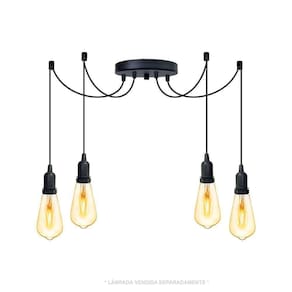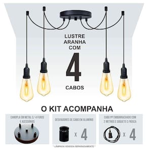 Lustre Aranha Com 4 Pendentes De 2 M + Soquetes Lustre Aranha com multiplos pendentes saindo da mesma canopla, muito elegante e com design minimalista, perfeito par uma decoração moderna. Cada pendente possui 2 metros de cabo e soquete. Ideal para ser junto com lâmpada de filamento no estilo retro. Descrição Técnica: - Modelo: Lustre Aranha com cabo + soquete - Número de pendentes: 4 - Comprimento de cada pendente: 2 metros - Material: Cabo PP preto - Canopla: Metal com furação - Acessórios: Trava cabo para canopla. - Soquete: Padrão Nacional E27 - Suporte: Barra chata para o teto