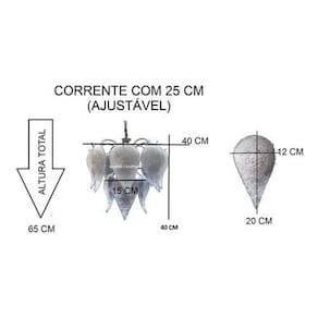 Lustre Folhas Para 3 Lampadas Soquete E27 Potência Máxima 60w Pode-se usar lâmpada Incandescente ou econômica. Base e acabamentos em inox cromado Folha em policarbonato branco com 20 x 12 cm 12 Folhas Diâmetro: 40cm + Comprimento 40 cm + 25 cm de corrente ajustável