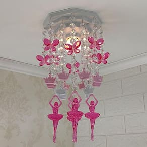 O destaque desse lustre está nos detalhes dos pingentes. As bailarinas, borboletas e coroas, feitas em acrílico nas cores rosa e branca, dão um toque especial e divertido ao lustre. Além disso, as castanhas de acrílico transparente e cor rosa também contribuem para a beleza desse produto.