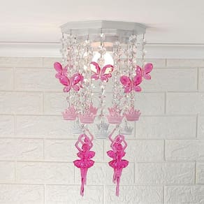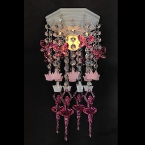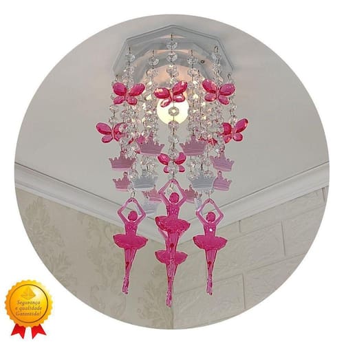 R: Os detalhes do lustre incluem castanhas de acrílico transparente e cor rosa, borboletas cor de rosa, bailarinas cor de rosa e coroas cor de rosa e branca.