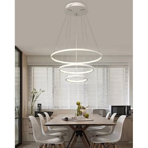 - led integrado - 3 led 36w, 30w e 23w - total 89w - luz branco quente 3200k - modelo: pendente led 3 anéis - material: estrutura em alumínio - difusor em sílica gel - cabo ajustável até 1. 5m fácil ajuste nos 3 aros para fazer o seu design . - diâmetro dos anéis: 1 anel 60cm/ 2 anel 40cm / 3 anel 30cm - acabamento: arcos brancos, luz branco quente. - voltagem: bivolt