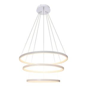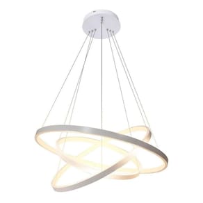 - led integrado - 3 led 36w, 30w e 23w - total 89w - luz branco quente 3200k - modelo: pendente led 3 anéis - material: estrutura em alumínio - difusor em sílica gel - cabo ajustável até 1. 5m fácil ajuste nos 3 aros para fazer o seu design . - diâmetro dos anéis: 1 anel 60cm/ 2 anel 40cm / 3 anel 30cm - acabamento: arcos prata, luz branco quente. - voltagem: bivolt