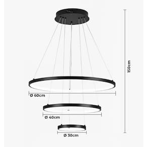 ESPECIFICAÇÕES TÉCNICAS: Marca: BRINOVAR Modelo: Pendente 3 Anéis Cor: Preto Acabamento: Acetinado Material: Aros e iluminação em led Indicação: Ambiente Interno Instalação: Teto Potência Total: 3 leds 23w, 30w e 36w - Total 89w Temperatura da Iluminação: Branco Neutro 3200k Sistema: Energia Elétrica Voltagem: Bivolt Medidas Arco Pequeno: Diâmetro 30cm Medidas Arco Médio: Diâmetro 40cm Medidas Arco Grande: Diâmetro 60cm Cabo ajustável de até 1.50 metros Fácil Ajuste Led integrado Garantia: 90 dias