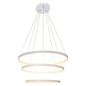 Especificações técnicasLed integrado3 led 36w, 30w e 23w - total 89wLuz branco quente 3200kModelo: pendente led 3 anéisMaterial: estrutura em alumínio com acabamento prateadoDifusor em sílica gelCabo ajustável até 2 m fácil ajuste nos 3 aros para fazer o seu design .Diâmetro dos anéis: 1 anel 60cm/ 2 anel 40cm / 3 anel 30cmAcabamento: arco prateado, luz branco quente.Voltagem: bivoltItens inclusos:Lustre pendente circularParafusos para instalação Marca: Brinovar