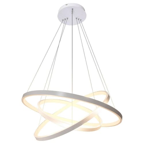 Especificações técnicas Led integrado 3 led 36w, 30w e 23w - total 89w Luz branco quente 3200k Modelo: pendente led 3 anéis Material: estrutura em alumínio com acabamento prateado Difusor em sílica gel Cabo ajustável até 2 m fácil ajuste nos 3 aros para fazer o seu design . Diâmetro dos anéis: 1 anel 60cm/ 2 anel 40cm / 3 anel 30cm Acabamento: arco prateado, luz branco quente. Voltagem: bivolt
