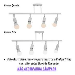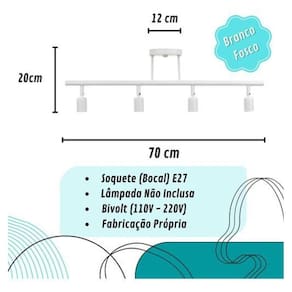 Luminária plafon 4 e27 trilho branco fosco --------------------------------------------------------------------------------------------------------------- Descrição do produto: Modelo: plafon trilho articulável 4 e27 Material: alumínio Cor do acabamento: branco fosco Tensão de rede: bivolt 127v / 220v Ambiente: interno/externo : 6 meses contra defeitos de fabricação Dicas importantes Produto com disponível. Confira o produto desejado antes de finalizar a compra. Tire todas as suas dúvidas com o vendedor. Mantenhas seus dados atualizados, após a compra as informações não poderão ser mudadas. Antes de abrir uma reclamação consulte o vendedor, temos o prazer em entender para atender. Aguardamos sua avaliação positiva : Contra defeitos de fabricação. Envio Loja de fábrica Marca: Não Informado
