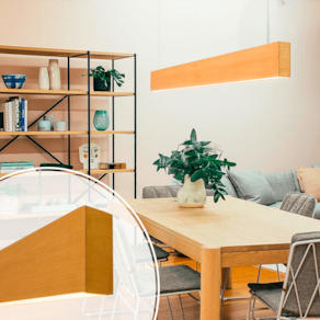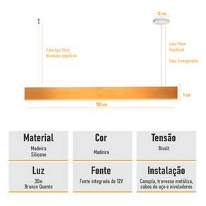 Descrição Técnica: - Modelo: SKN04 - Acabamento: Natural - Material: 100% Madeira e Silicone LED - Tamanho (LxAxP): 100 x 9 x 3 cm - Cabo: 1 m (regulável) - Suspenção: Cada cabo de aço com 70cm regulável - Led: Fita LED 20W - Bivolt: Sim - Canopla: Em metal - Acompanha Fonte para fita LED