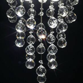 O lustre é feito com cristais legítimos K9 super brilhantes. Sua composição inclui 49 pêndulos, com 49 esferas de 30 mm e aproximadamente 300 castanhas de 14 mm. A combinação dessas peças cria um brilho intenso e elegante, tornando-o um ponto focal na decoração.