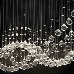 O lustre é composto por uma impressionante cascata de cristais legítimos: são 80 pêndulos com esferas de 30 mm e aproximadamente 450 castanhas de 14 mm. A combinação dessas peças cria um brilho intenso e sofisticado, tornando-o um ponto focal em qualquer ambiente.