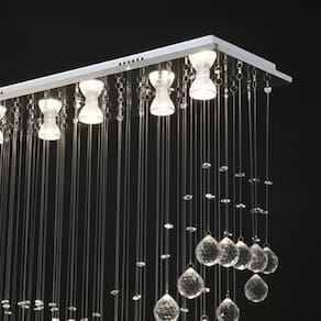 Este lustre pendente é a escolha ideal para quem busca um toque de luxo e sofisticação. Com sua base retangular de 20x70 cm em aço inoxidável espelhado, ele cria um efeito visual deslumbrante, refletindo a luz dos cristais de forma magnífica.