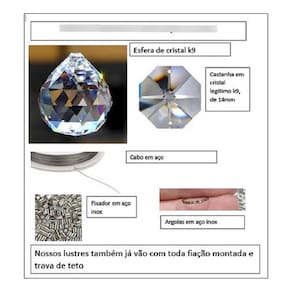 Instalação e EspecificaçõesA instalação é simples e segura. O lustre acompanha um kit de instalação completo e um manual prático, para que você possa encaixar os pêndulos facilmente. Para garantir a segurança durante o transporte, os pêndulos são enviados embalados separadamente, evitando danos à peça.