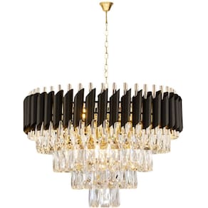 É refinado e impactante. O cristal utilizado neste pendente é uma fonte de brilho e transparência que encanta e fascina. Quando a luz incide sobre ele, cria reflexos e padrões que preenchem com uma aura de beleza e magia. Ao todo são 81 cristais divididos em 4 andares na estrutura do lustre. Além disso, o metal preto com dourado, adiciona requinte e solidez à peça.