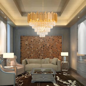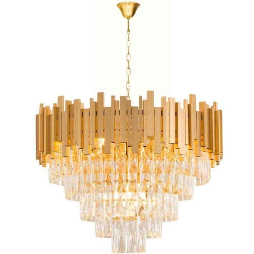 É refinado e impactante. O cristal utilizado neste pendente é uma fonte de brilho e transparência que encanta e fascina. Quando a luz incide sobre ele, cria reflexos e padrões que preenchem com uma aura de beleza e magia. Ao todo são 160 cristais divididos em 5 andares na estrutura do lustre. Além disso, o metal dourado, adiciona e combina solidez e estabilidade à peça.