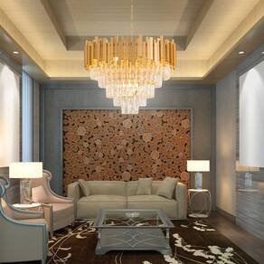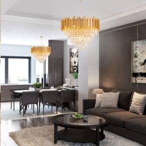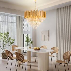 O Lustre Suspenso de Teto Gimpo KJDD-VG5 é uma obra prima luminosa que combina a delicadeza do cristal com a solidez do metal. O resultado se traduz em sofisticação e charme. A combinação perfeita de iluminação e design. Com seu aspecto imponente e proporções generosas, este pendente se destaca como uma verdadeira joia em qualquer ambiente, iluminando não apenas o espaço, mas também a imaginação. Com um diâmetro de 57 centímetros e uma altura de 88 centímetros, capacidade para até 9 lâmpadas E14 total 360 Watts , encanta os olhos e captura a atenção.