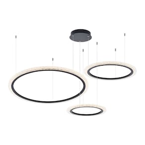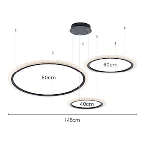 Especificações Gerais do Produto: Voltagem: Bivolt Dimensões AxLxP (mm): De cima para baixo: Círculo 1: 600mm; Círculo 2: 800mm; Círculo 3: 400mm (Largura total do lustre 1450mm) Cor: Preto Material: Alumínio e Acrílico Garantia: 1 ano junto ao fabricante Referência: PL-9739 Cor Principal: Preto Fluxo Luminoso: 8960 lúmens Comprimento dos Cabos: Cabo ajustável, máximo 200 cm Potência: 112W Local de Uso: Interno Modelo/Tecnologia: LED Embutido Temperatura da Cor: 3000K - Branco Quente