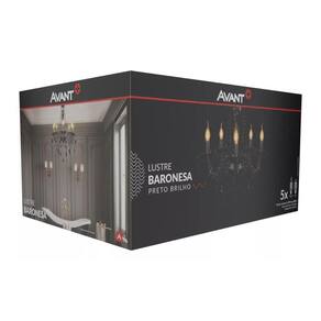 - Marca: Avant; - Base: E14; - Cores: Preto Brilho; - Materiais: Aço, Vidro; - Hastes: 5; - Potência Máxima: 5X15W; - Lâmpada Indicada: Vela LED, Vela Retrô; - Modelo: 785070070; - Cabo ajustável em até 1,5 metro; - Canopla em aço; - Lâmpada indicada: Vela e Vela chama (E14). (Lâmpadas não inclusas); - Garantia: 12 meses junto ao fabricante.