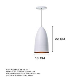 Especificações Técnicas: Marca: Ideallume Modelo: Bala Produto: Lustre Tamanho: M Cor: Branco Dimensões: 22 x 13 cm Canopla: redonda de 11cm de diâmetro Material: Alumínio Fio: Ajustável de 150cm Soquete: E-27 utilize a lâmpada que desejar Garantia: Garantia de 6 meses contra defeitos de fabricação