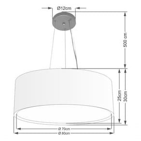 Pendente Moderno Indicado para decoração área interna, como mesas, sala de estar, sala de jantar, suite, quartos, corredor, hall, mezanino, escadas, churrasqueira, lareira, área de circulação, lojas, comércios, restaurante, varanda, balcão.DimensãoCúpula em Tecido: 80x30cm