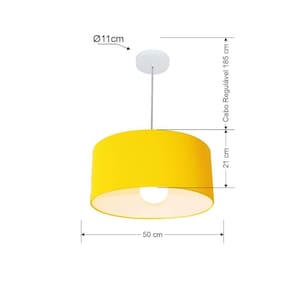 Pendente Moderno Indicado para decoração área interna, como mesas, sala de estar, sala de jantar, suíte, quartos, corredor, hall, mezanino, escadas, churrasqueira, lareira, área de circulação, lojas, comércios, restaurante, varanda, balcão.DimensãoCúpula em Tecido: 50x21cm