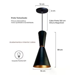 Design Moderno e Versátil: Com seu formato de cone e acabamento preto sofisticado, este lustre é perfeito para decorar mesas, balcões e áreas de estar, adicionando um toque de estilo e personalidade ao ambiente.