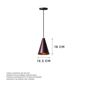 Especificações Técnicas: Marca: Ideallume Modelo: Cone Produto: Pendente Tamanho: P Cor: Marrom Dimensões: 18 x 12,5 cm Canopla: redonda de 11cm de diâmetro Material: Alumínio Fio: Ajustável de 150cm Soquete: E-27 utilize a lâmpada que desejar Garantia: Garantia de 6 meses contra defeitos de fabricação