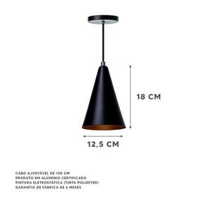 Lustre Pendente Cone P Em Alumínio Preto 18Cm Deixe sua casa muito mais moderna e sofisticada com o Lustre Pendente Cone Da Ideallume. Produzido em alumínio, o produto não enferruja. O Lustre é ideal para ser utilizado em áreas externas e internas. Com esse produto você dará um toque de beleza que valoriza sua casa. Especificações Técnicas: Marca: Ideallume Modelo: Cone Produto: Pendente Tamanho: P Cor: Preto Dimensões: 18 x 12,5 cm Canopla: redonda de 11cm de diâmetro Material: Alumínio Fio: Ajustável de 150cm Soquete: E-27 utilize a lâmpada que desejar : de 6 meses contra defeitos de fabricação IMPORTANTE: Lâmpadas não inclusas neste produto. Conteúdo Da Embalagem: 01 Lustre Pendente Cone P Preto Alumínio Decoração Marca: Não Informado Ean: 7909463260705