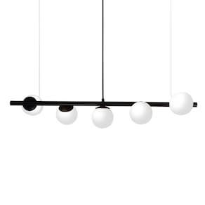 Lustre Pendente Preto - 5 Globos Esfera De Vidro Branco A linha de luminárias modelo tem um ar contemporâneo, um estilo moderno, minimalista e ao mesmo tempo uma sensação retrô. Os pendentes podem ser colocadas em quartos, salas de jantar ou estar e as arandelas indicamos para lounges, salas, dormitórios ou até mesmo em lavabos. Com Design simples trazem classe e estilo a qualquer ambiente. Todos luminárias da linha são produzidas em alumínio com esferas de vidro branco. Descrição Técnica: - Modelo: Lustre Pendente com 6 Globos de Vidro - Acabamento: Pintura a pó térmica - Tamanho dos Globos de Vidro: 120mm - Quantidade de Globos de Vidro e soquetes: 5 - Material: Globo em Vidro e Hastes em Alumínio - Tamanho Aproximado (LxAxP) com os Globos de Vidro: 100 cm X 20 cm X 20 cm - Cabo: Cabo Revestido em Tecido - 70cm - Soquete: Padrão G9 - Bivolt: Sim ****