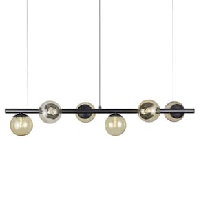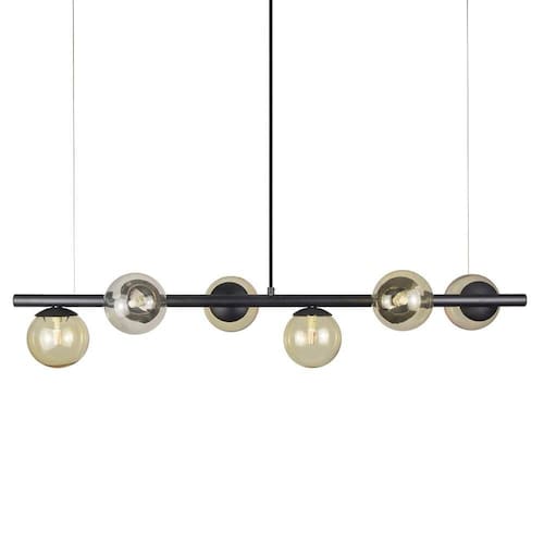 Lustre Pendente Preto - 6 Globos Esfera De Vidro âmbar A linha de luminárias modelo tem um ar contemporâneo, um estilo moderno, minimalista e ao mesmo tempo uma sensação retrô. Os pendentes podem ser colocadas em quartos, salas de jantar ou estar e as arandelas indicamos para lounges, salas, dormitórios ou até mesmo em lavabos. Com Design simples trazem classe e estilo a qualquer ambiente. Todos luminárias da linha são produzidas em alumínio com esferas de vidro. Descrição Técnica: - Modelo: Lustre Pendente com 6 Globos de Vidro - Transparente Âmbar - Acabamento: Pintura a pó térmica - Tamanho dos Globos de Vidro: 120mm - Quantidade de Globos de Vidro e soquetes: 6 - Material: Globo em Vidro e Hastes em Alumínio - Tamanho Aproximado (LxAxP) com os Globos de Vidro: 100 cm X 20 cm X 20 cm - Cabo: Cabo Revestido em Tecido - 70cm - Soquete: Padrão G9 - Bivolt: Sim ****
